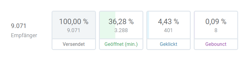 Und das Beste ist: Die E-Mails werden nicht einfach so ins Blaue hinein verschickt – sondern du kannst direkt im Anschluss an den Versand beobachten, wie erfolgreich deine Mails sind. Es werden nämlich automatisch Kennzahlen wie Öffnungs- und Klickraten erhoben, die dir zeigen, wie gut deine E-Mails bei deiner Zielgruppe ankommen.