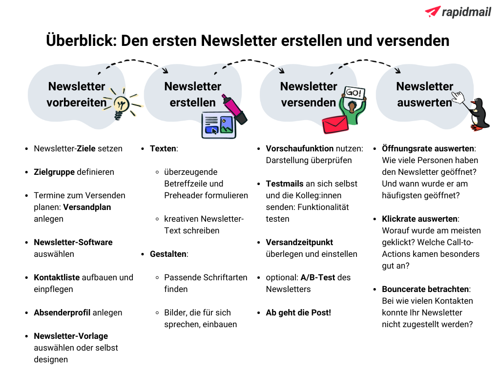 Für den besseren Durchblick zeigen wir Ihnen zum Abschluss eine Übersicht, in der alles Wichtige rund um das Erstellen und Versenden Ihres ersten Newsletters nochmal zusammengefasst ist.