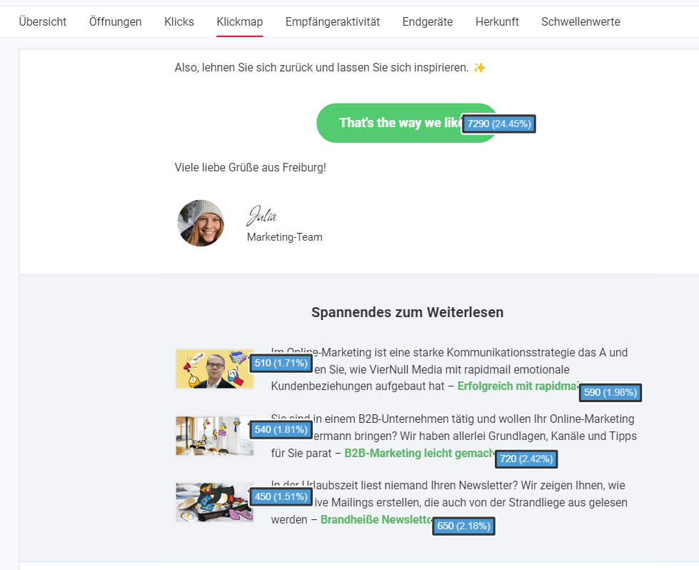 In der rapidmail Klickmap sehen Sie zum Beispiel auf einen Blick, ob für Ihre Zielgruppe eher Bild- oder Textlinks besser funktionieren. So optimieren Sie Ihre nächste E-Mail-Marketing-Kampagne gezielt und verbessern Schritt für Schritt Ihre Ergebnisse.