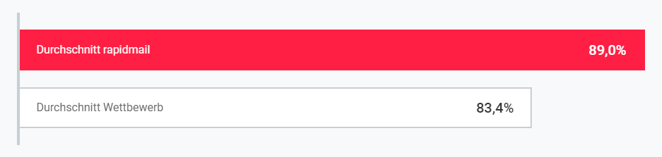 Dass sich unsere tägliche Arbeit auszahlt, zeigen unsere exzellenten Zustellraten: Im Vergleich zur durchschnittlichen Zustellrate der Mitbewerber überzeugt rapidmail in den letzten drei Tests von EMailToolTester als verlässlicher Newsletter-Postbote.